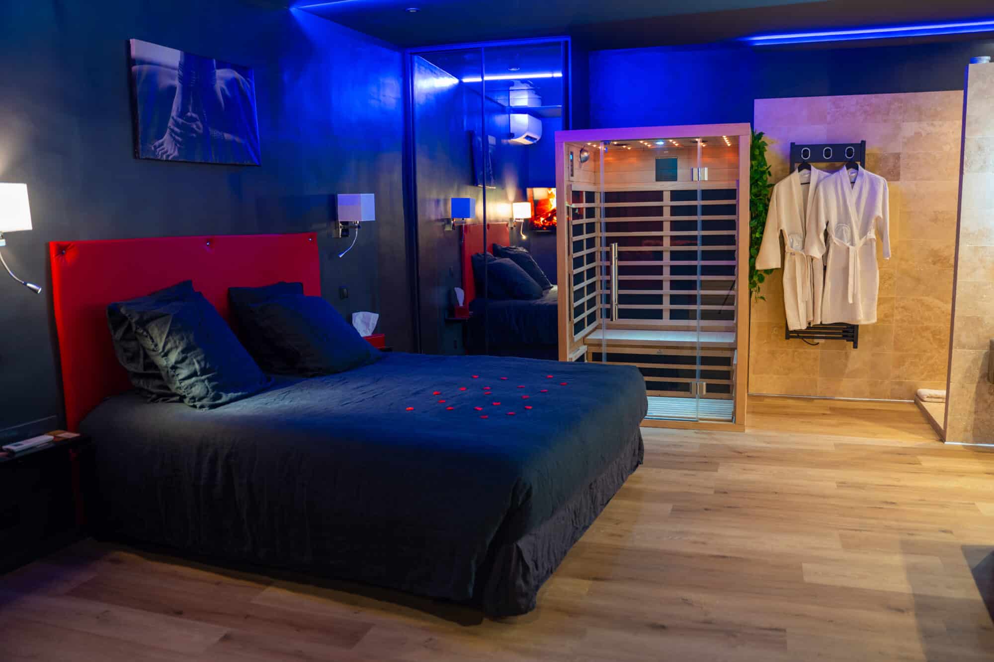 Sa localisation est idéale pour une escapade romantique. Profitez d’une baignoire balnéo avec chromathérapie, d’une spacieuse douche à l’italienne, et d’un lit King Size conçu pour des nuits douces et passionnées. Son sauna vous invite à un pur moment de détente. Chaque détail a été pensé pour stimuler vos sens.